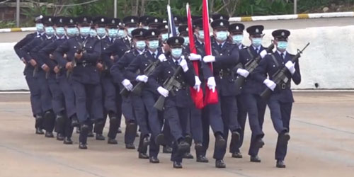 仪仗队指挥官手擎指挥刀用粤语高喊口令:正步走!身着礼服的仪仗队员精神抖擞、整齐划一,铿锵的足音发出清晰的信息:这是中式步操。雄壮的中华人民共和国国歌响彻香港警察学院上空,五星红旗冉冉升起。“一条大河波浪宽,风吹稻花香两岸”,熟悉的旋律在耳边响起,演奏乐曲的是知名的香港警察乐队。乐队队员身着白色上衣、黑色长裤的礼服,演绎这首被十几亿中国人所熟稔的经典老歌,现场响起热烈的掌声。
